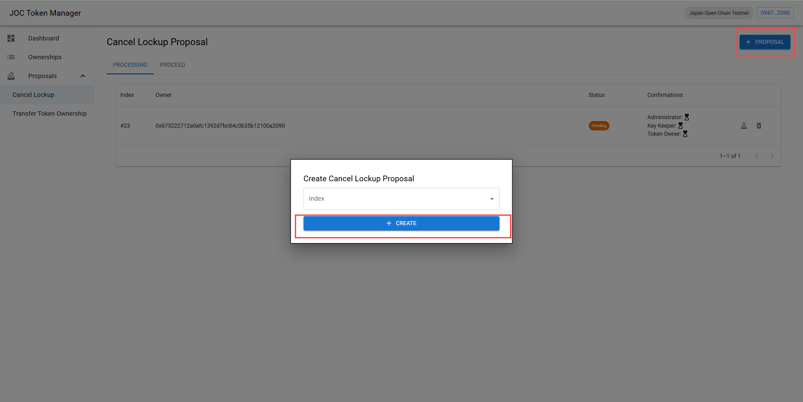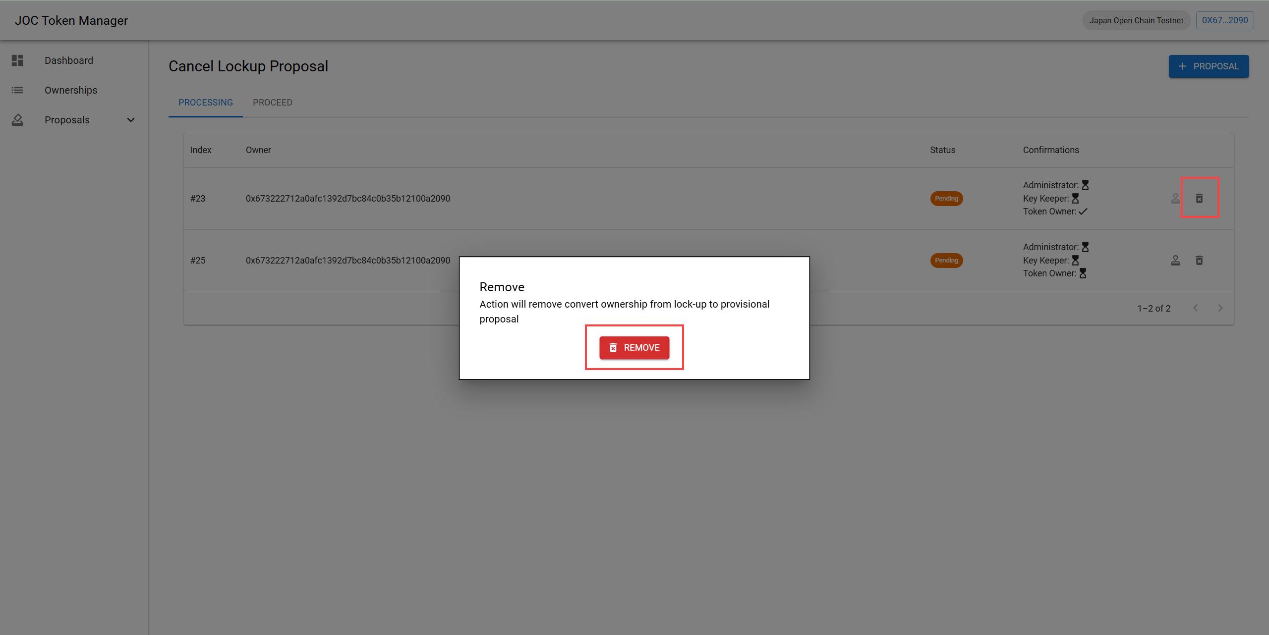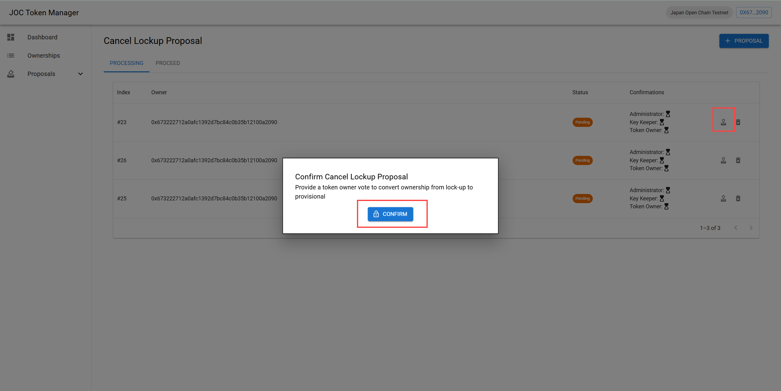 You can create Cancel Lockup Proposal requests. This action can only be performed on Ownerships with the status OWNERSHIP LOCKUP or VESTING LOCKUP. Once the request is created, approval from 2 out of 3 individuals with the roles Administrator, Key Keeper, or Token Owner is required. After approval, the Ownership will transition to the [PROVISIONAL] status.