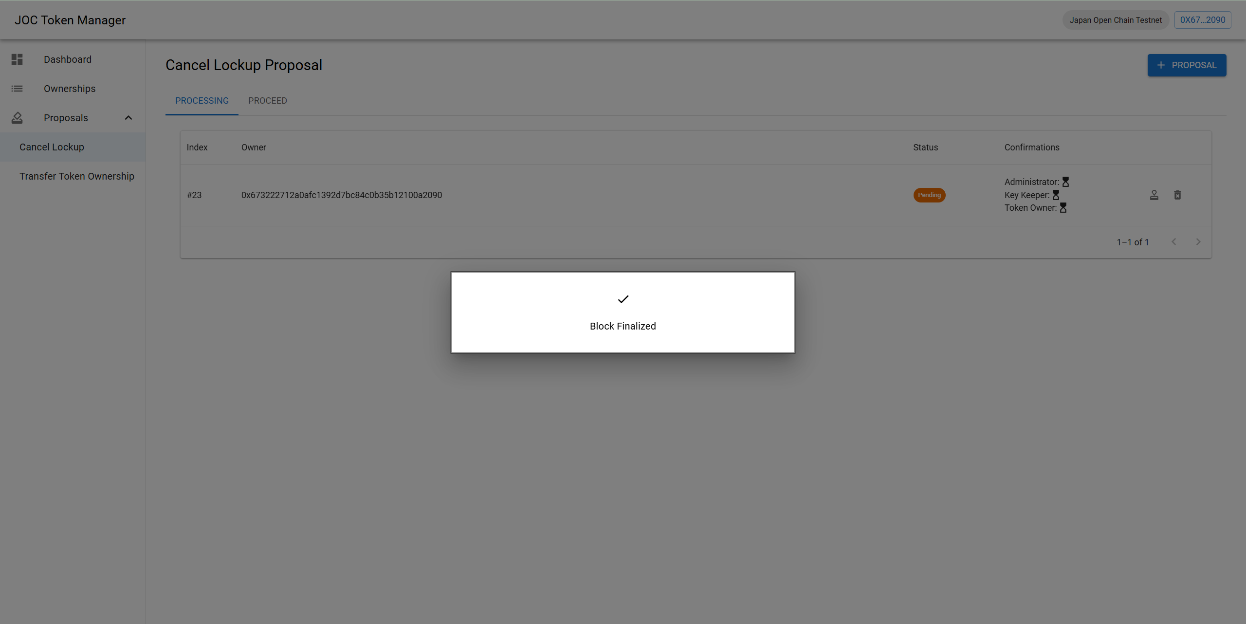- Once the Cancel Lockup Proposal request is successfully created, a success notification will be displayed on the screen.