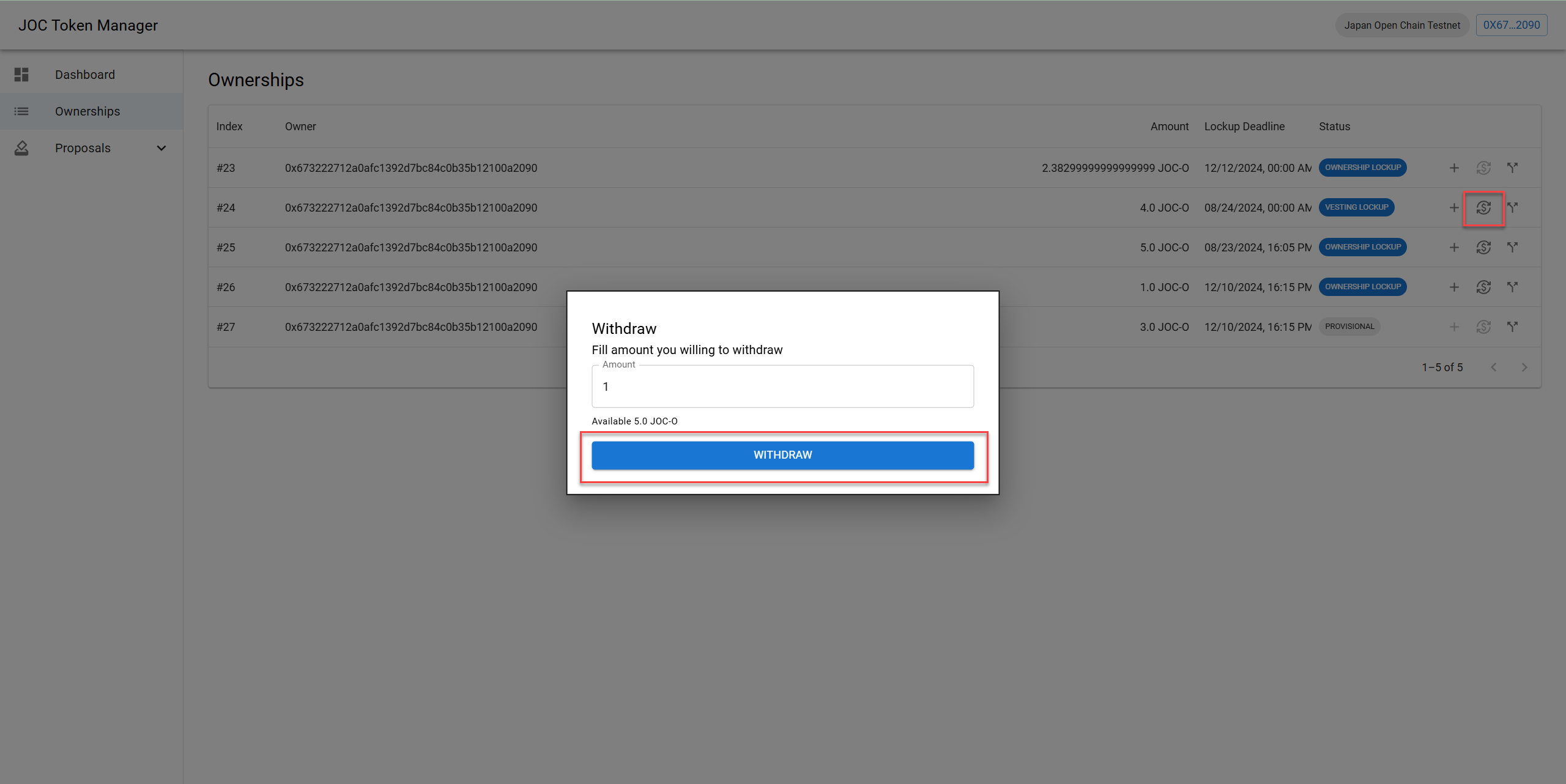 - Click the [+] button in the Ownership section to initiate Withdrawal.