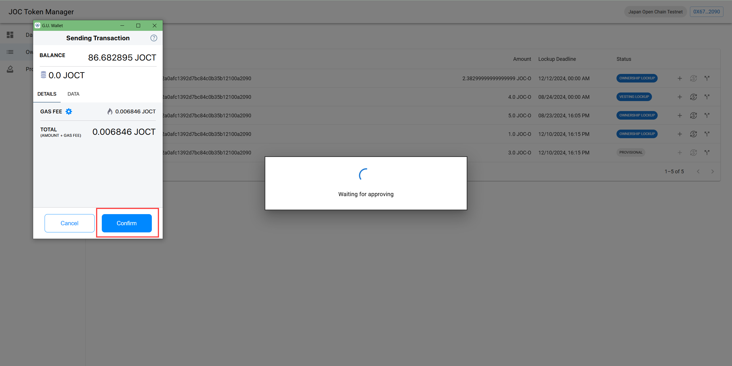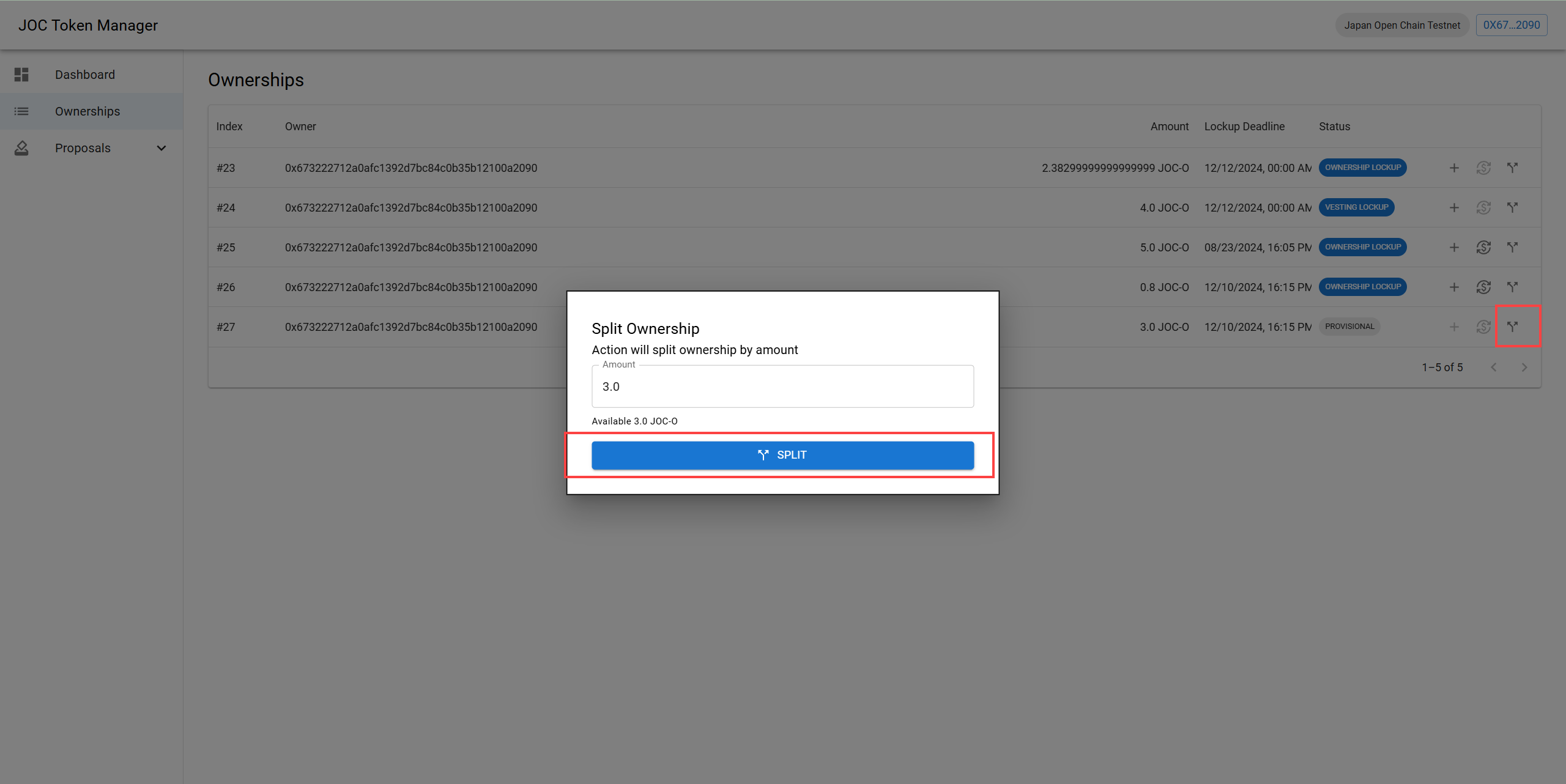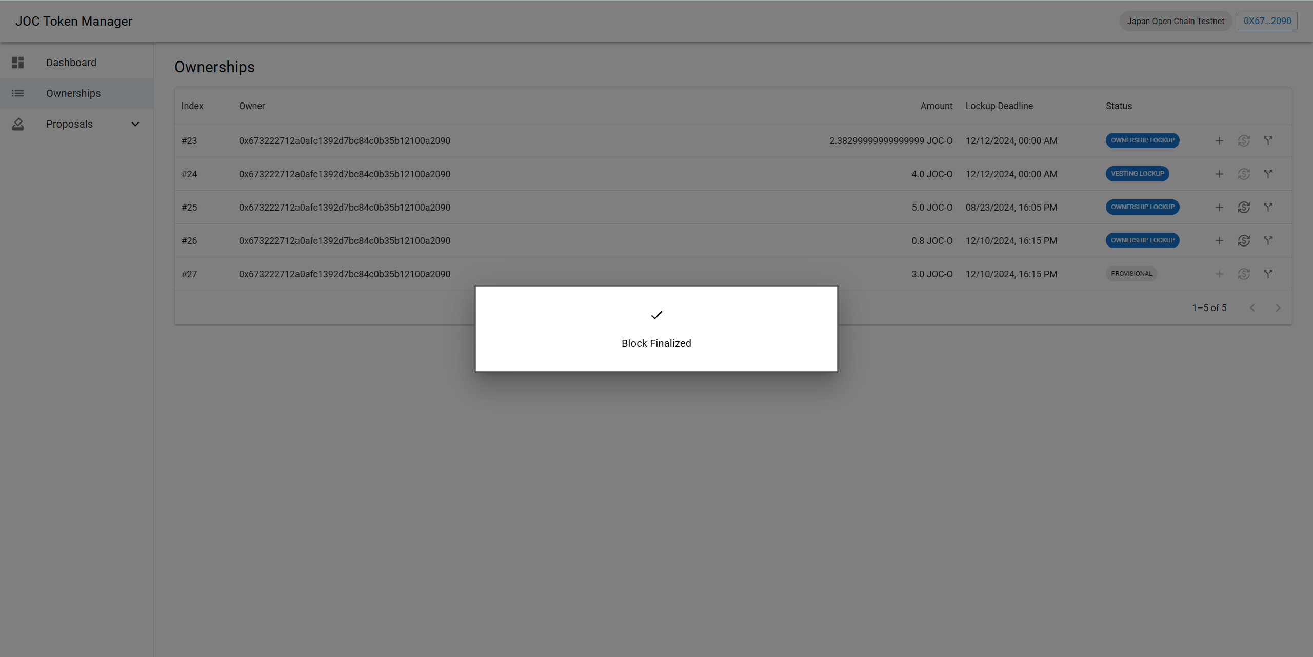 The JOC Token Manager - Ownerships screen will display the list of Ownerships. On this screen, you can perform the following actions: